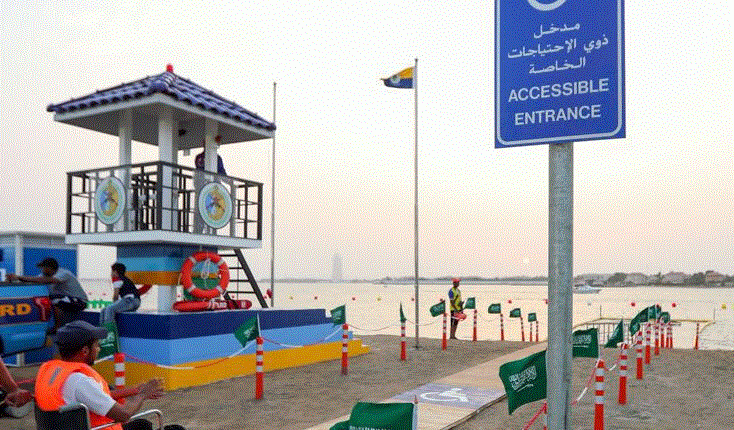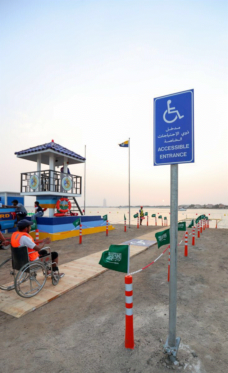 أشاد معالي الأمين العام للمنظمة البحرية الدولية السيد/ كيتاك ليم مساء بموقع السباحة المخصص لذوي الإحتياجات الخاصة، وما يحتويه من تجهيزات خاصة ووسائل السلامة البحرية واللوحات الإرشادية وبرج للمراقبة؛ إضافة إلى الممر الخاص بسباحتهم.