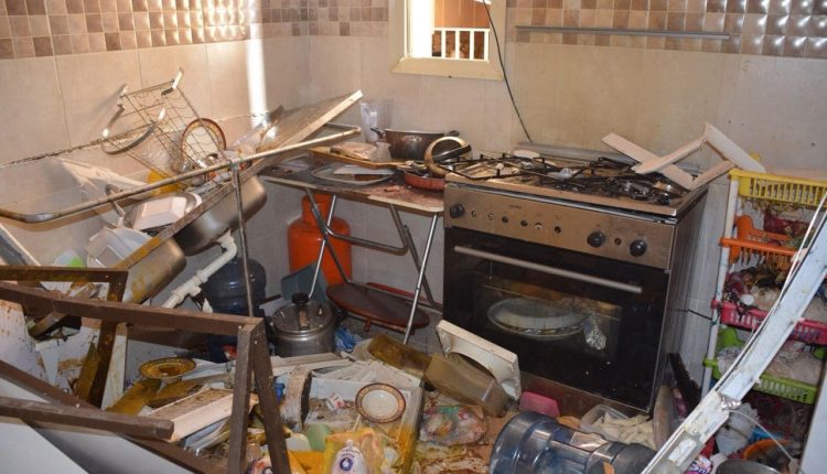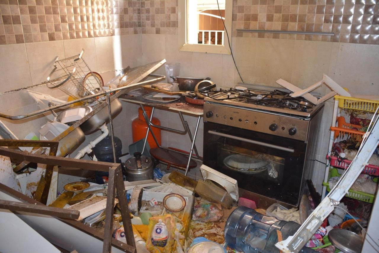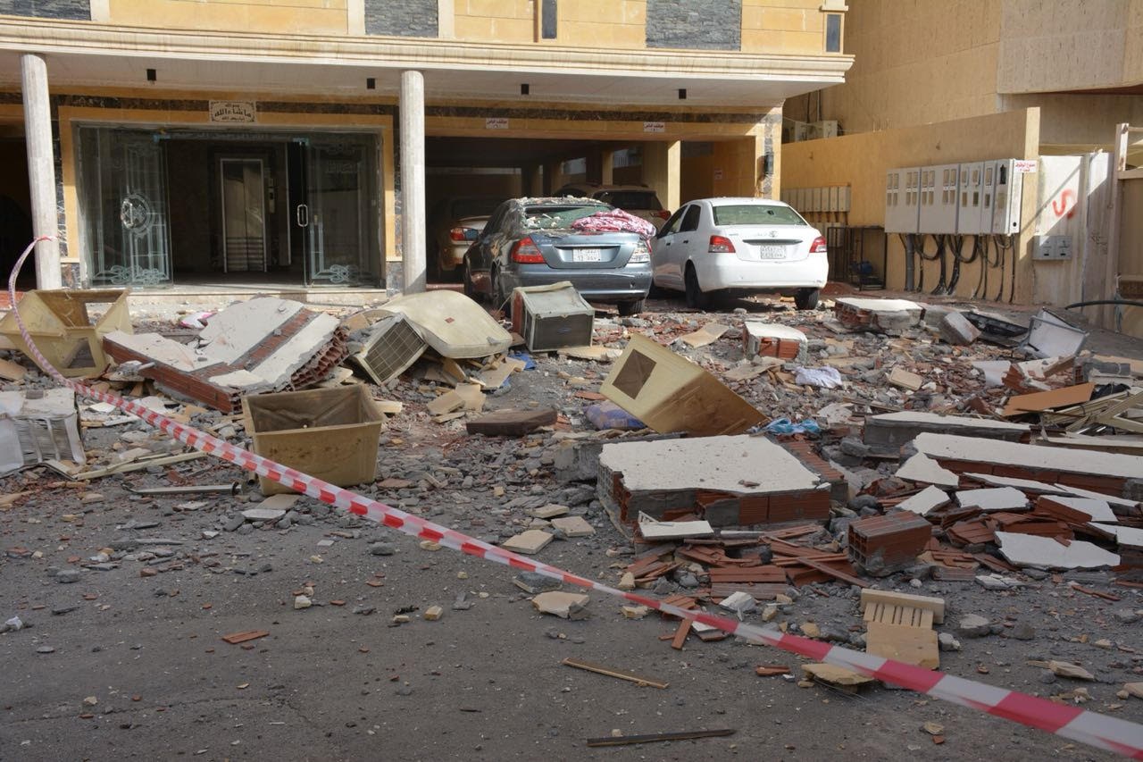 كما تضررت واجهة الشقة باضرار بليغة وسقطت الحوائط الامامية من الدور الرابع لتوقع اضراراً مادية على بعض العربات المتوقفه امام البنية ، كما نتج عن التسرب الذي تشبعت به اروقة الشقة في تحطيم بعض الابواب الداخلية وصولا الى باب مصعد البناية ليسجل اضرار طفيفة بالباب ،