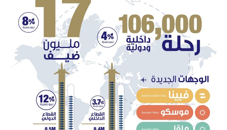 وفي التفاصيل، واصل القطاع الداخلي تحقيق أرقام متنامية في عدد الضيوف وسجل خلال النصف الأول نموا بنسبة (3,7%) حيث تم نقل (8,4) مليون ضيف على أكثر من (61,7) ألف رحلة بين (27) مطارا داخل المملكة، فيما سجل معدل النمو في أعداد الضيوف على الرحلات الدولية قفزة جديدة بنسبة تجاوزت (12%) حيث تم نقل أكثر من (8,5) مليون ضيف على متن (44,2) ألف رحلة دولية بزيادة قدرها (6%) في عدد الرحلات .