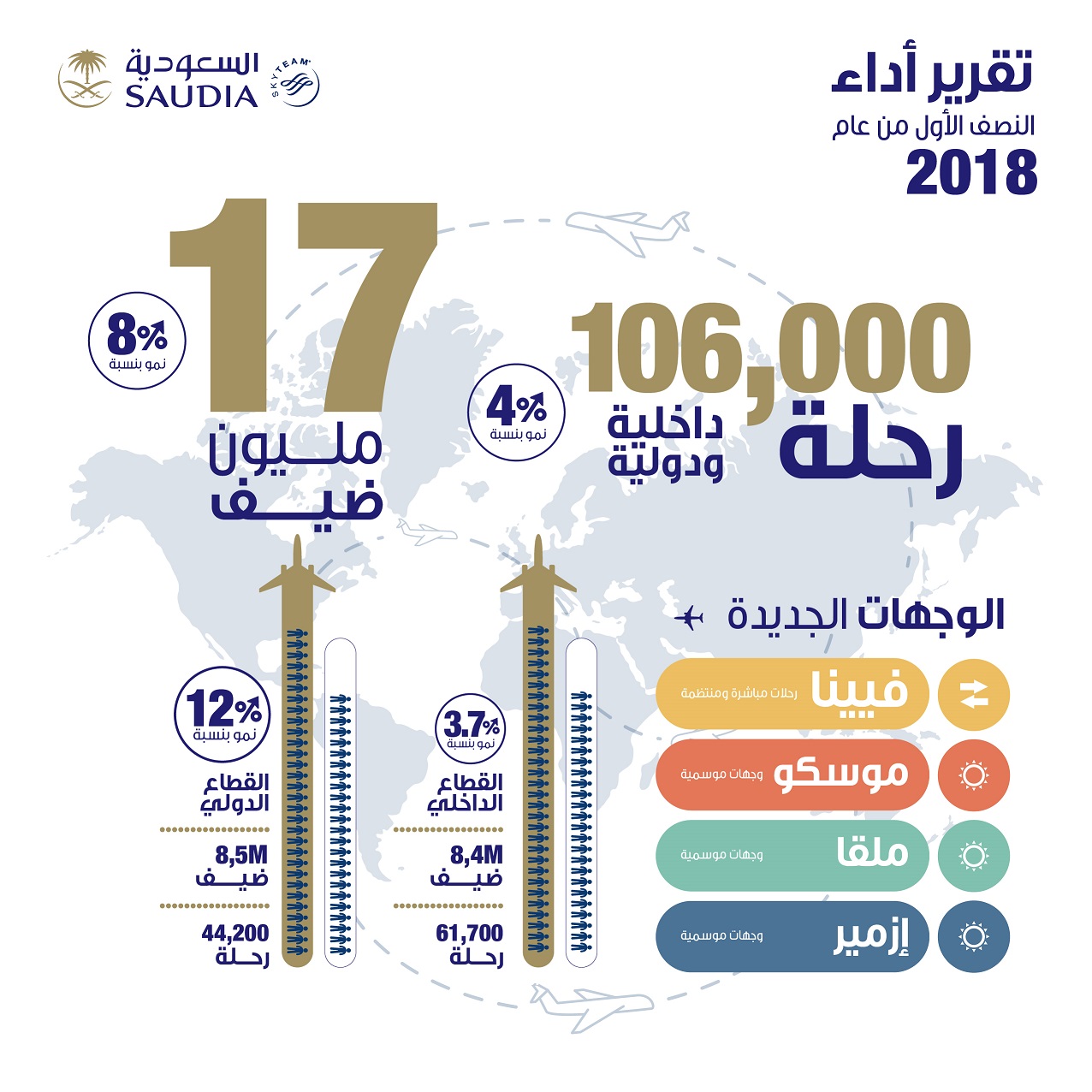 حققت الخطوط السعودية معدلاً تشغيلياً متميزاً في أعداد الضيوف وعدد الرحلات خلال النصف الأول لعام 2018م ، حيث تم نقل قرابة (17) مليون ضيف على متن أكثر من (106) آلاف رحلة على القطاعين الداخلي والدولي حلقت في الأجواء (246) ألف ساعة طيران، وسجل الأداء التشغيلي نموا في عدد الضيوف بنسبة (8%) وفي عدد الرحلات بنسبة (4%) مقارنة بذات الفترة من العام الماضي .