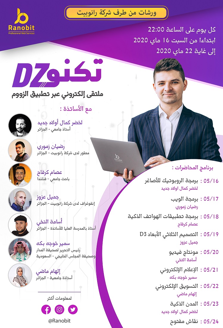 تنظم شركة ” رانوبيت ” المتخصصة في تكنولوجيا المعلومات ومقرها بعين وسارة بولاية الجلفة الجزائرية يوم السبت المقبل ملتقى تكنوDZ –عن بعد- بسبب جائحة ” كورونا” المنتشرة هذه الأيام في العالم .